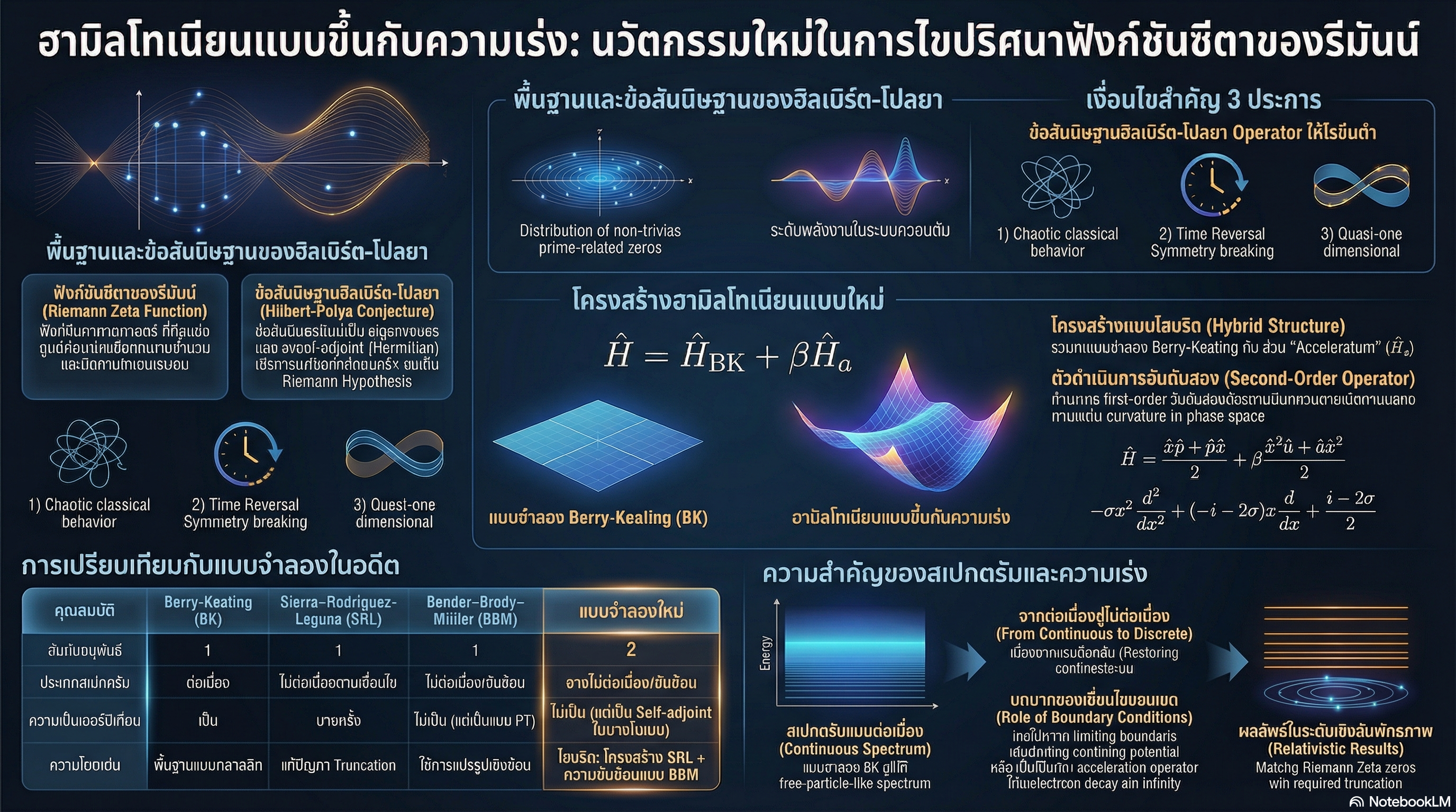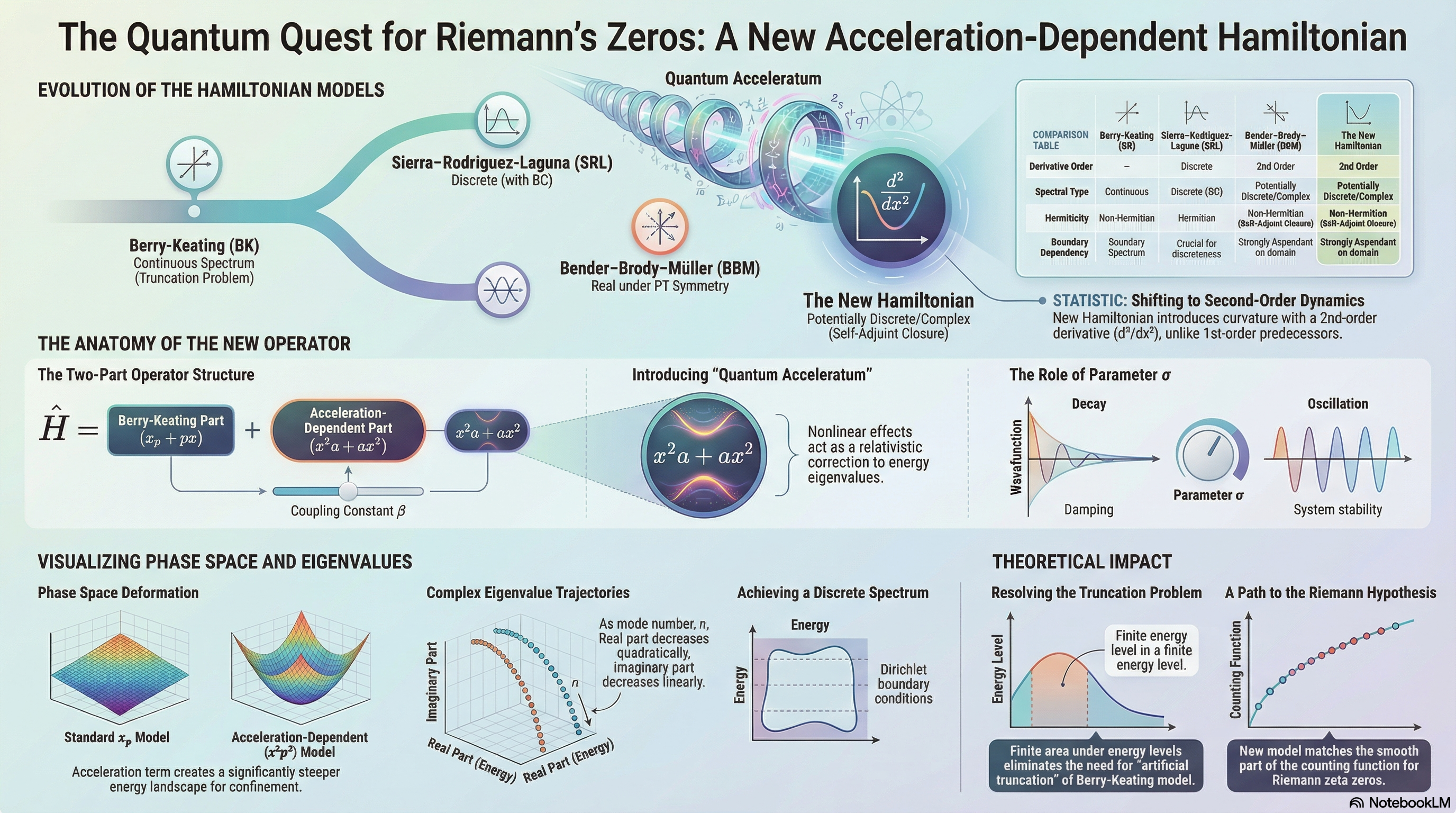 The provided research introduces a novel acceleration-dependent Hamiltonian operator ( $\hat{H}$ ) designed to investigate the spectral properties of the zeros of the Riemann zeta function. This operator synthesizes the established Berry-Keating operator with a new “quantum acceleratum operator,” introducing nonlinear effects beyond conventional canonical mechanics. The central objective is to provide a mathematical framework that supports the Hilbert-Polya conjecture, which suggests that the non-trivial zeros of the Riemann zeta function correspond to the eigenvalues of a Hermitian operator.